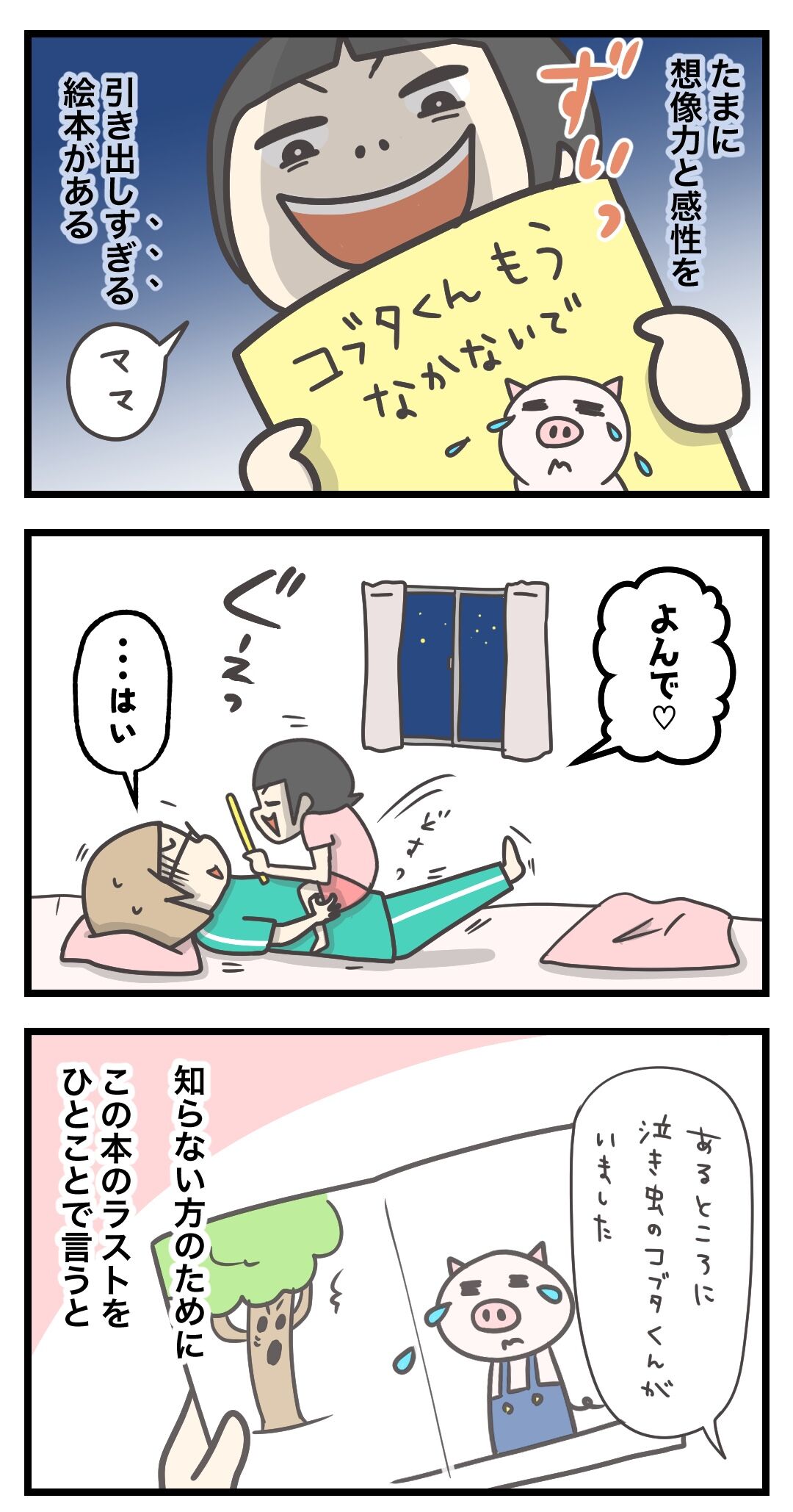 「コブタくんもうなかないで」 私も大好きなお話! 何度も読んでると結末もわかってくるので ラストの木が喋らなくなってしまうシーンで ジージョ大号泣ですわ😭 5歳になって 「死」を理解できるようになったのもあり もうわんわん泣いて その後、コブタがいい事いうんですけど 全然聞く耳持たず!!🙉 ただただ悲しくて終わっちゃうっていう… 作者さんの意図が汲み取られない〜 さんざん泣き喚いて 私にぶつけてきた質問が5歳ならではでした🙌 (2)に続きます!